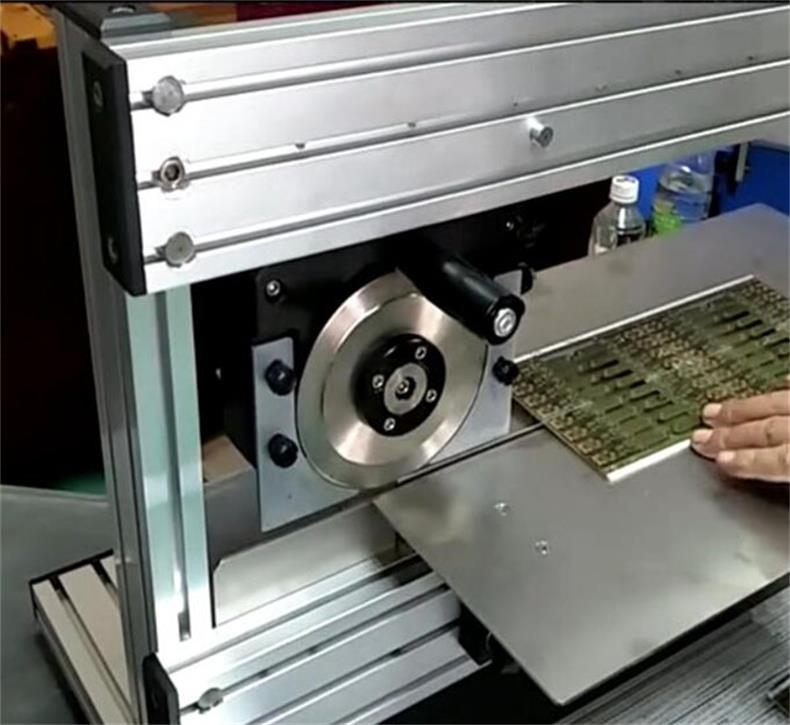 将要进行分切的V-CUT连板的V形槽对准下切刀的刀刃口,然后手推手柄,圆形刀片左右移动,从而将V-CUT连板分离。